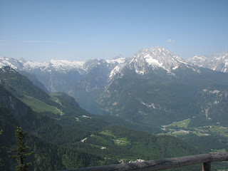 After a scrumptous traditional german breakfast (brotchen, jellies, meat and cheeses) we headed out. Our first stop was to Kleinhaus (Eagle's Nest in English). This was Hitler's 50th birthday present; a huge house on the top of the Alps. We had to take a bus ride to the top of the mountain; this was a very narrow road...so narrow that the bus was the only vehicle that could fit on the road. Jakob and Feliciti didn't even want to look over the edge because it was that high and we could "tip" over as Thom jokingly told the kids if everybody looked over at one time. Once we got to the top of the mountain we had to walk through a man-made tunnel through the mountain to get to Hitler's brass elevator to get to his house. We were unable to view his house, b/c it was only open to those people who took a tour, and we were not allowed to take the tour b/c we had kids under the age of 6. But we were able to view the outside of his house, and the magnificent view he had. Here are some pictures of what we saw.